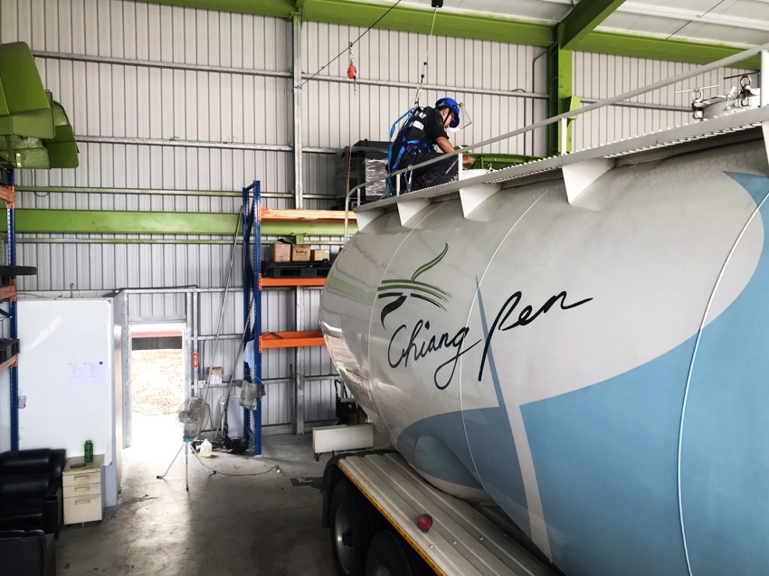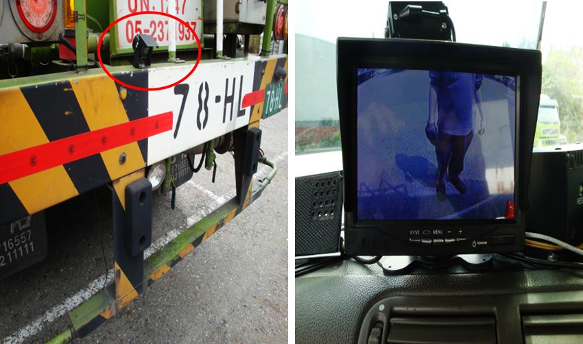 在每部槽車後方裝置攝影鏡頭,執行倒車作業時,駕駛艙內螢幕會自動放大全螢幕且影像全時錄影,以確保倒車作業時之安全。