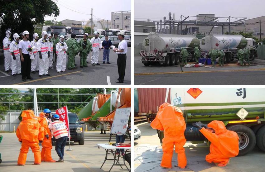 年度定期舉辦緊急應變演練,如化學物品洩漏事故演練以及各項車禍事故演練……等,以防事故發生時降低災害擴散。